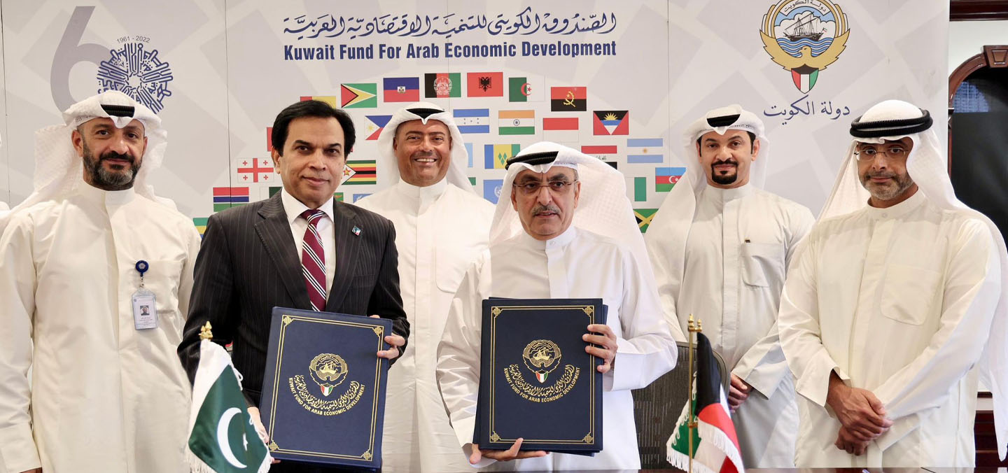 الدكتور/ ظفر إقبال – سفير جمهورية باكستان الإسلامية لدى دولة الكويت ، بينما وقع اتفاقيه القرض نيابة عن الصندوق الكويتي للتنمية الاقتصادية العربية ، السيد/ وليد شملان البحر – المدير العام بالوكالة .